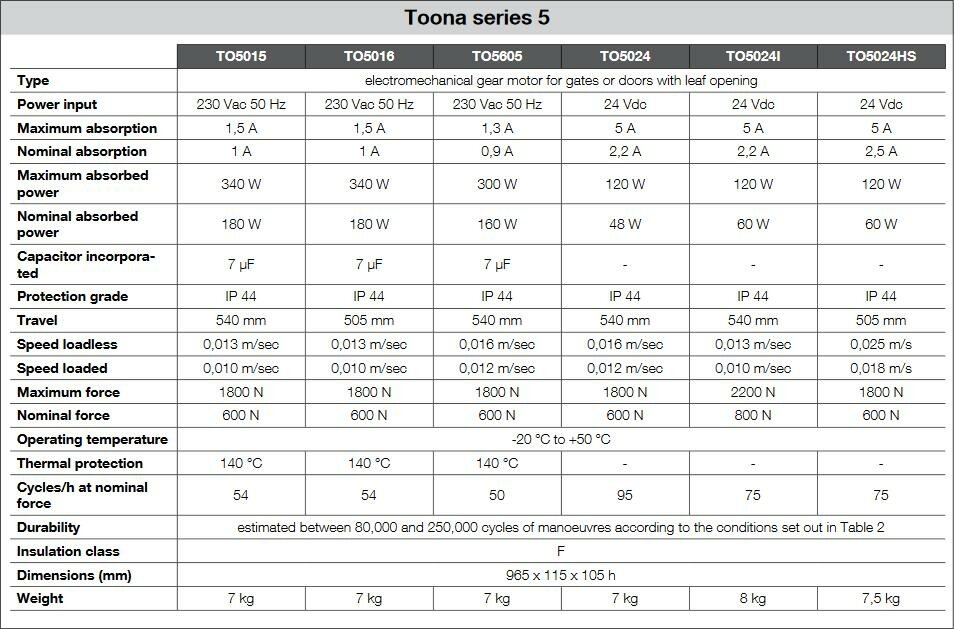 ToonaKit je nová sada pro automatizaci jednokřídlé brány určená pro intenzivní provoz a pro zatížení až 80%. Maximální délka jednoho křídla 3m a hmotnost jednoho křídla do 500kg (závisí na délce křídla). Napájecí napětí pohonu 24V DC, napájecí napětí řídící jednotky 230V AC. Pohon TO5024 je velmi přesný díky zabudovanému encodéru otáček, který vyhodnocuje řídící jednotka, která díky tomu může přesně vypočítat, v jaké pozici se pohon nachází a kdy má zpomalit.