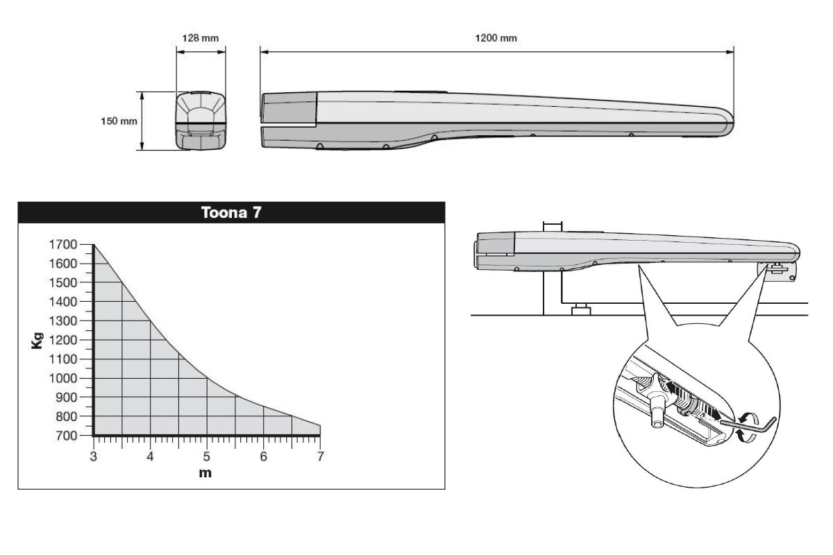 TOONA70241K je sada pro automatizaci jednokřídlé brány určená pro intenzivní provoz a pro zatížení až 80%. Maximální délka jednoho křídla 7m a hmotnost jednoho křídla do 1700kg (závisí na délce křídla). Napájecí napětí pohonu 24V DC, napájecí napětí řídící jednotky 230V AC. Pohon TO7024 je velmi přesný díky zabudovanému encodéru otáček, který vyhodnocuje řídící jednotka, která díky tomu může přesně vypočítat, v jaké pozici se pohon nachází a kdy má zpomalit.
