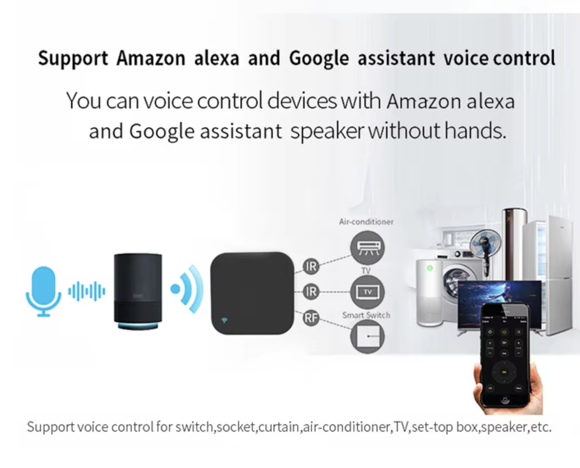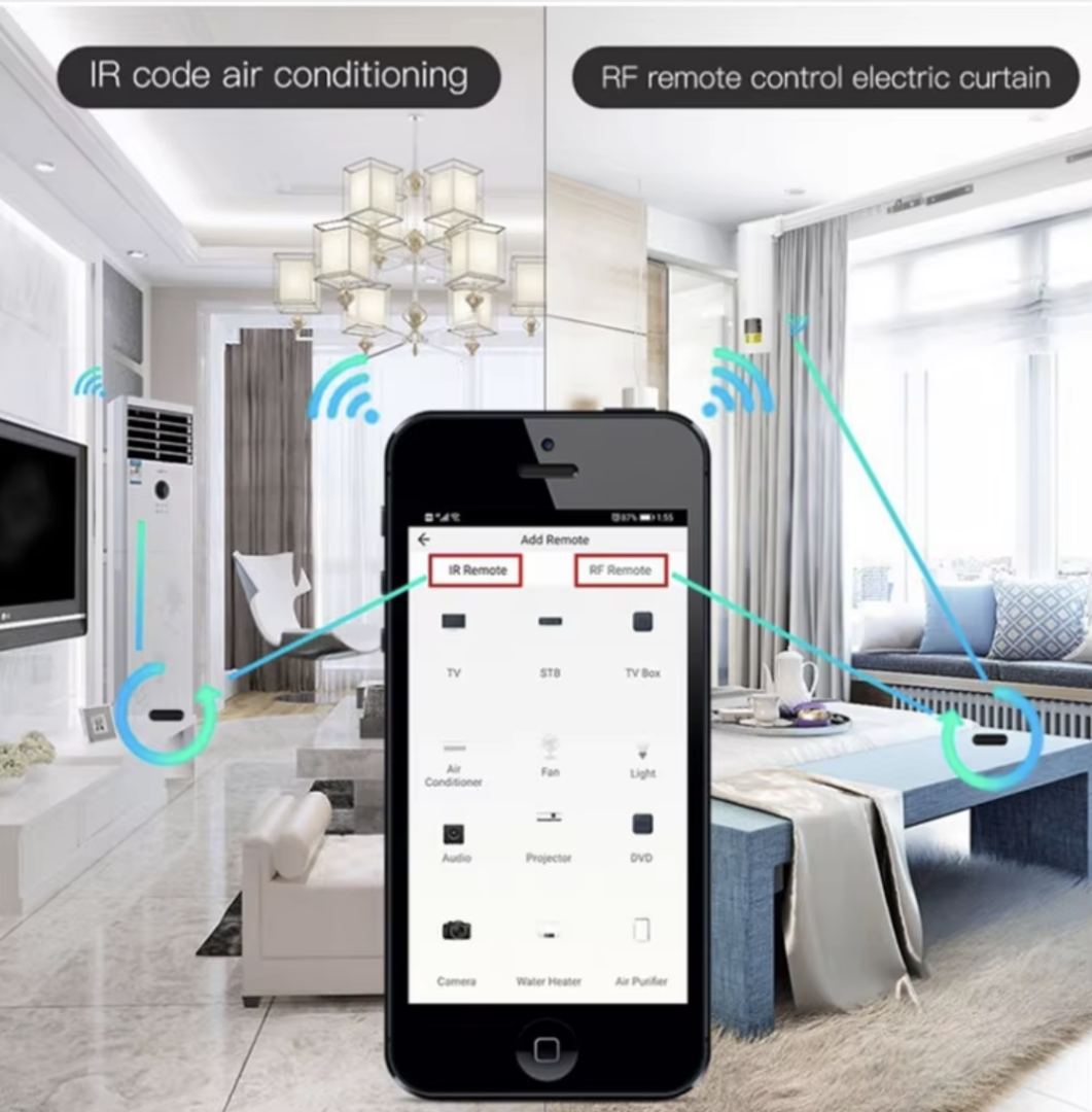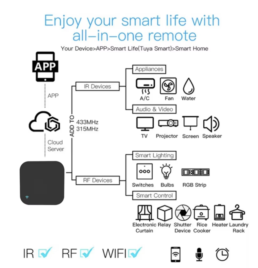 Univerzální WiFi ovladač pro IR a RF zařízení. Ovládáte TV, klimatizaci, set-top box, rolety nebo RF vypínače přes mobilní aplikaci Tuya / Smart Life. Podpora 433 MHz i 315 MHz.