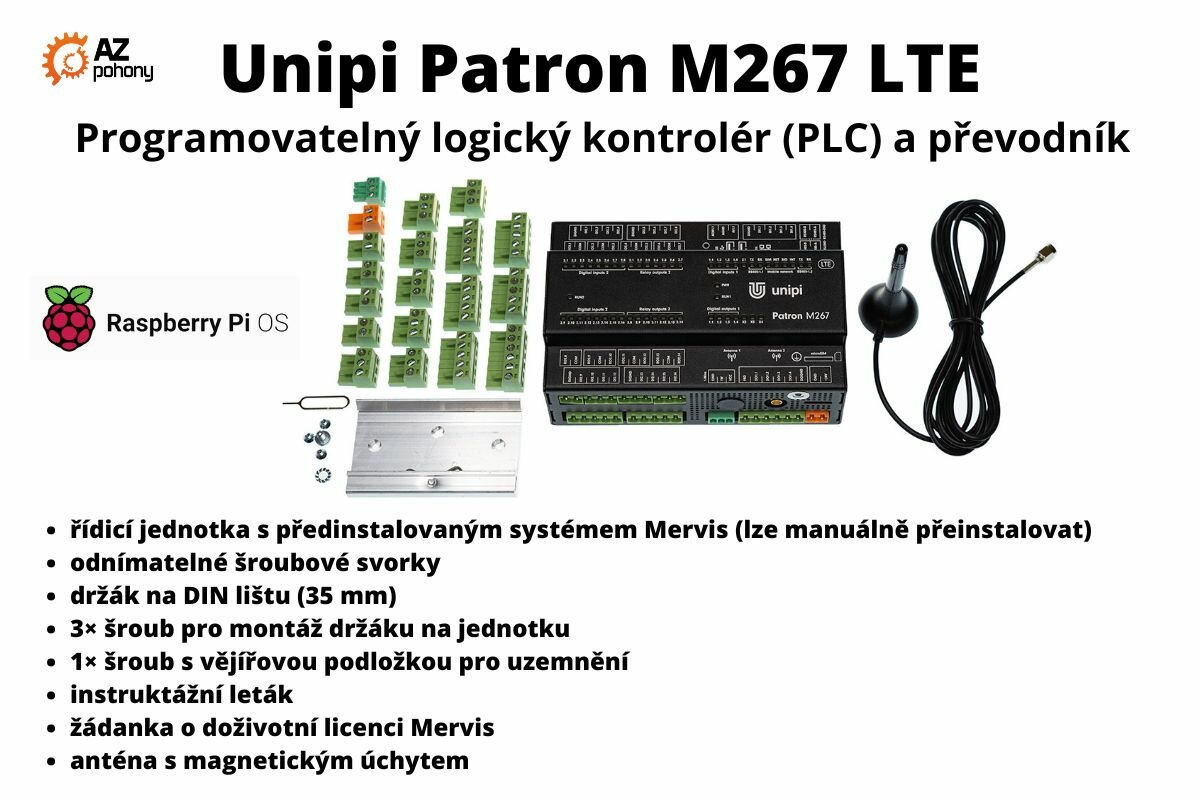Programovatelný logický kontrolér (PLC) a převodník Unipi Patron M267 je určený pro automatizaci, ovládání, regulaci a monitoring. Model M267 je vybaven vyšším počtem digitálních vstupů/výstupů a reléových výstupů vhodných pro širokou škálu nasazení v rozsáhlejších projektech. Speciální vlastností modelu M267 je funkce LTE pro připojení k vysokorychlostnímu bezdrátovému internetu včetně posílání a odesílání SMS. Vedle toho je jednotka vybavena i dvojicí sériových linek RS485 pro připojení rozšiřujících modulů a převodníků. Výbavu doplňuje rozhraní 1-Wire pro připojení digitálních čidel teploty a vlhkosti.