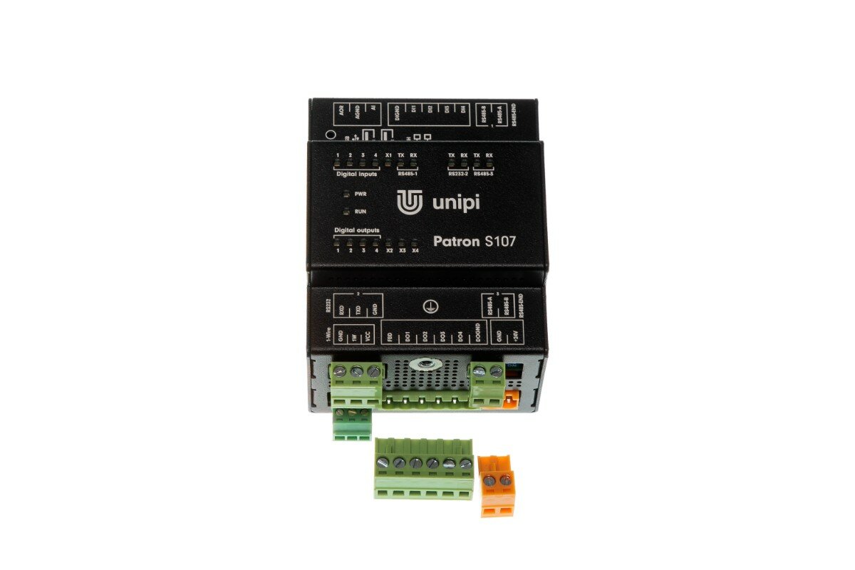 Programovatelný logický kontrolér (PLC) a převodník Unipi Patron S107 je navržen pro automatizaci, ovládání, regulaci a monitoring. Kompaktní model S107 nabízí univerzální kombinaci vstupů a výstupů vhodnou pro jednoduché instalace, která zahrnuje digitální a analogové I/O. Vedle toho je řídicí jednotka vybavena i trojicí sériových rozhraní RS485 a RS232 pro připojení rozšiřujících modulů a převodníků. Výbavu doplňuje rozhraní 1-Wire pro připojení digitálních čidel teploty a vlhkosti. Ke všem kontrolérům Patron je poskytována prodloužená tříletá záruka.