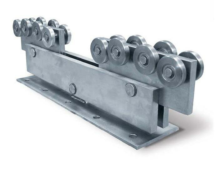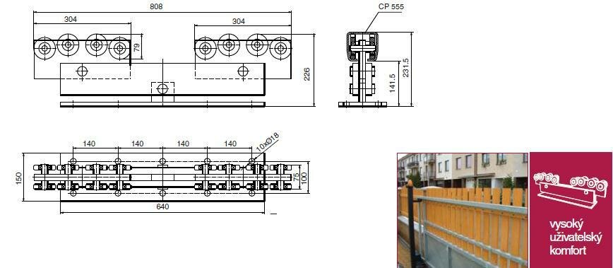 Dvojitý kyvný nosný vozíček (použijte 2 kusy pro maximální zatížení 800 kg), zapouzdřená ložiska, sulfátovaný, maximální výnos 10 m. Určen pro nosný C profil 97(š) x 90(v) tl. 5,5 mm.