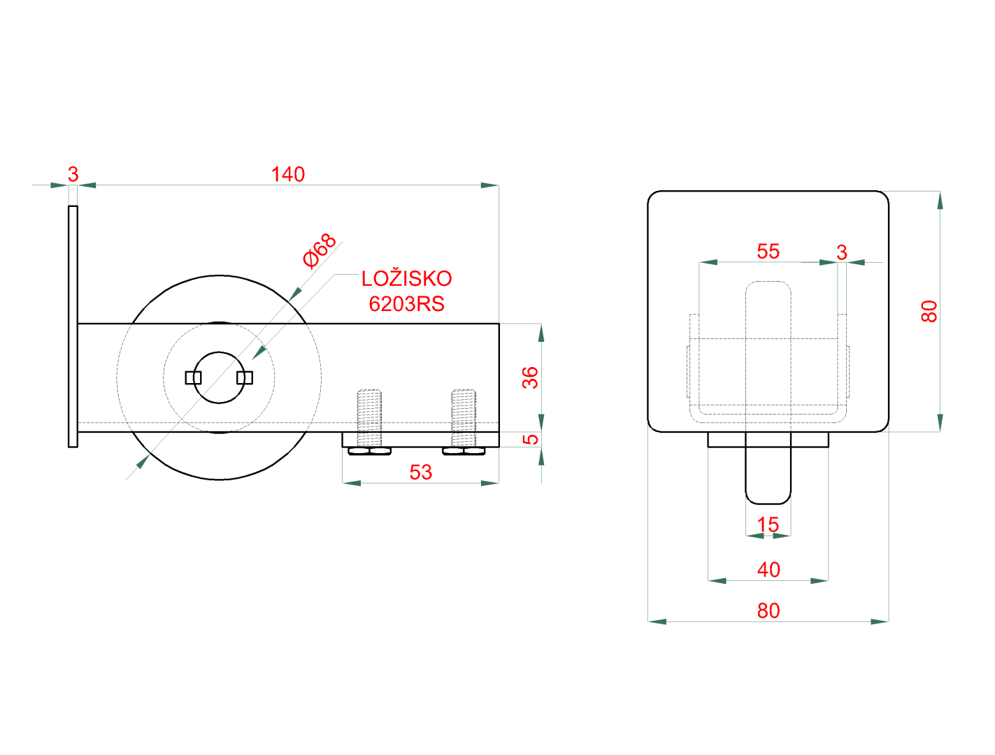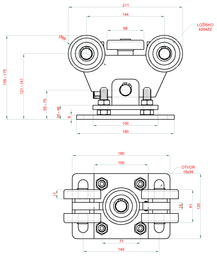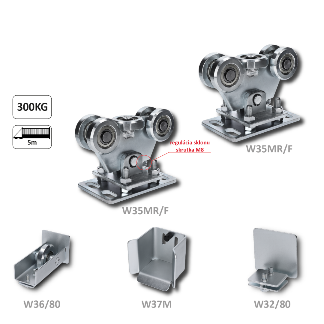 Set pro samonosný systém 80 x 80 x 5 mm, 2x regulovatelné vozíky, 1x doraz, 1x náběhové kolečko