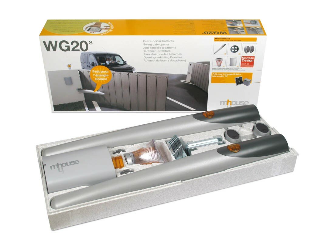 Plná sada pohonu pro křídlovou bránu do 4,5 m šířky jednoho křídla a hmotnosti jednoho křídla maximálně 450 kg (závisí na délce křídla). Pohon se vyznačuje tichým chodem, spolehlivostí a snadnou instalací. Jedná se o kvalitní pohon s jednoduchou, ale přitom robusní konstrukcí. Výrobce pohonů Mhouse se vyznačuje dlouholetou tradicí ve výrobě pohonů a zakládá na kvalitě, ale také funkčnosti svých výrobků. Výhodou sady pohonu WG20 je nastavení parametrů pohonu na dálku pomocí dálkového ovladače. Nastavení síly pohonu lze regulovat ve čtyřech krocích. Samozřejmostí je částečné otevření brány - průchod pro pěší. Další skvělou funkcí řídící jednotky v této třídě pohonů je možnost připojení elektrického zámku do řídící jednotky pomocí případné elektroniky EL1. Funkce plynulého nastavení zpoždění zajistí přesný chod obou pohonů a zpoždění křídel přesně podle Vašich požadavků. Ve čtyřech krocích lze také nastavit čas automatického zavírání (od 10s do 80s). V nastavení pohonu lze také nastavit citlivost na překážky ve čtyřech variantách.