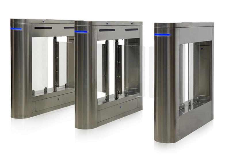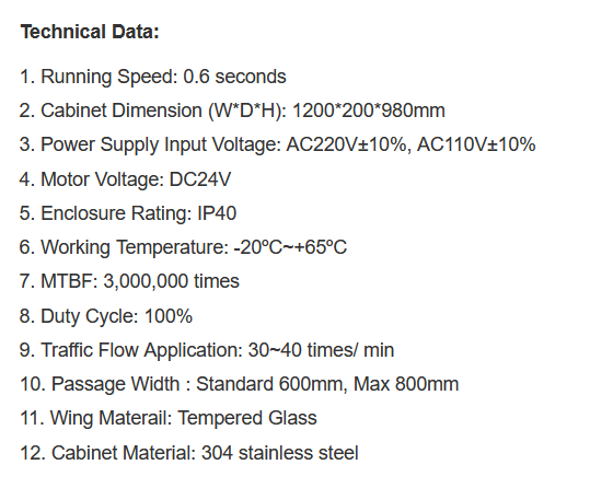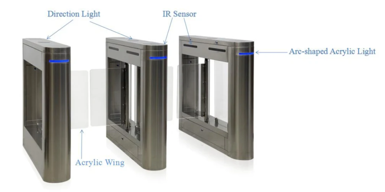 Jednokřídlá branka v housingu z nerezové oceli. Křídlo branky je zhotoveno z akrylu. Šířka průchodu 600-800mm pro obě křídla, 300-400mm pro jedno křídlo. Specifikace šířky průchodu bude uvedena v objednávce, po uhrazení zálohy bude zakázka zadána do výroby. Termín od zadání do výroby je na vyžádání, podle aktuální situace a nejméně je 2-3 měsíce.