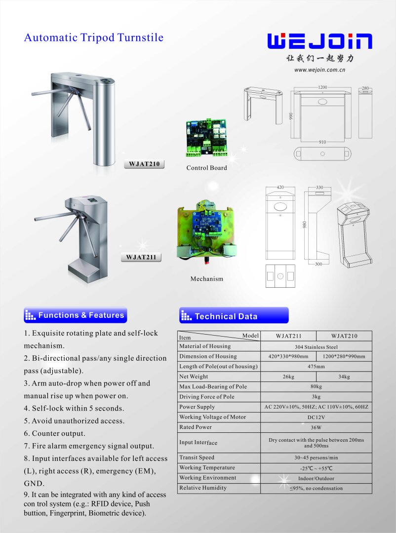 Plně automatický turniket obsahuje motor, který pomáhá uživateli s průchodem, např. v případě, že je vstup povolený, tak se tripod mírně otočí ve směru průchodu a motor také "dotočí" tripod na správnou polohu.