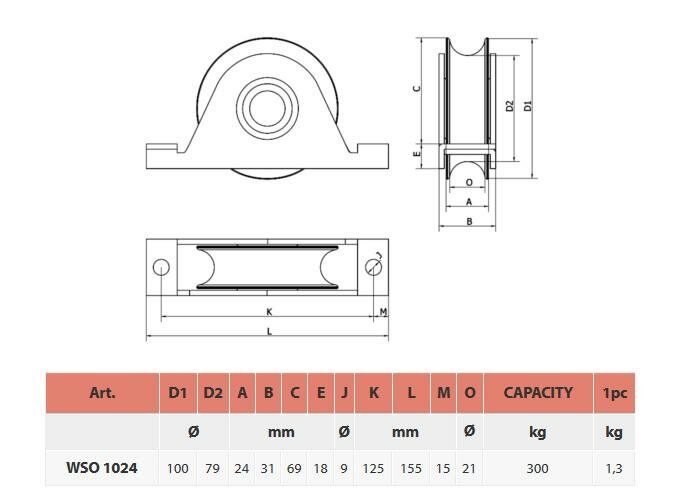 Nosné jednoložiskové kolo o průměru 100 mm k omega profilu, nosnost 2 kol je 300 kg.