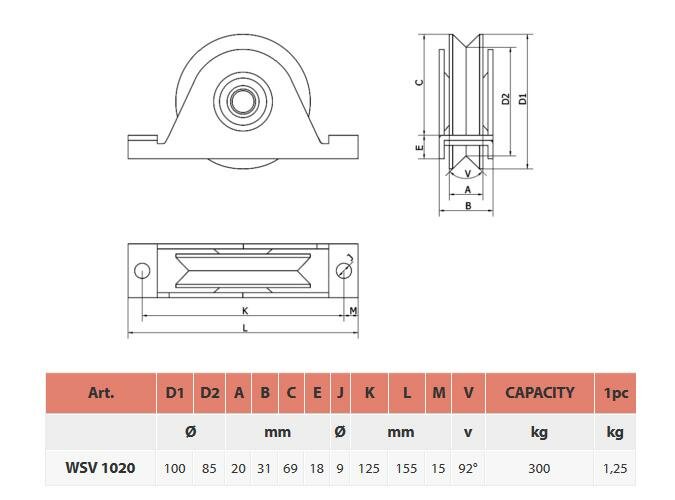 Nosné jednoložiskové kolo o průměru 100 mm k V profilu, nosnost 2 kol je 300 kg.