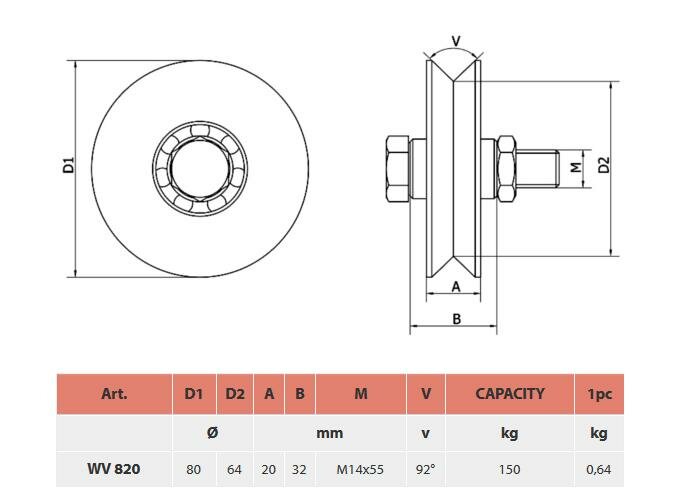 Nosné jednoložiskové kolo o průměru 80 mm k V profilu, nosnost 2 kol je 150 kg.