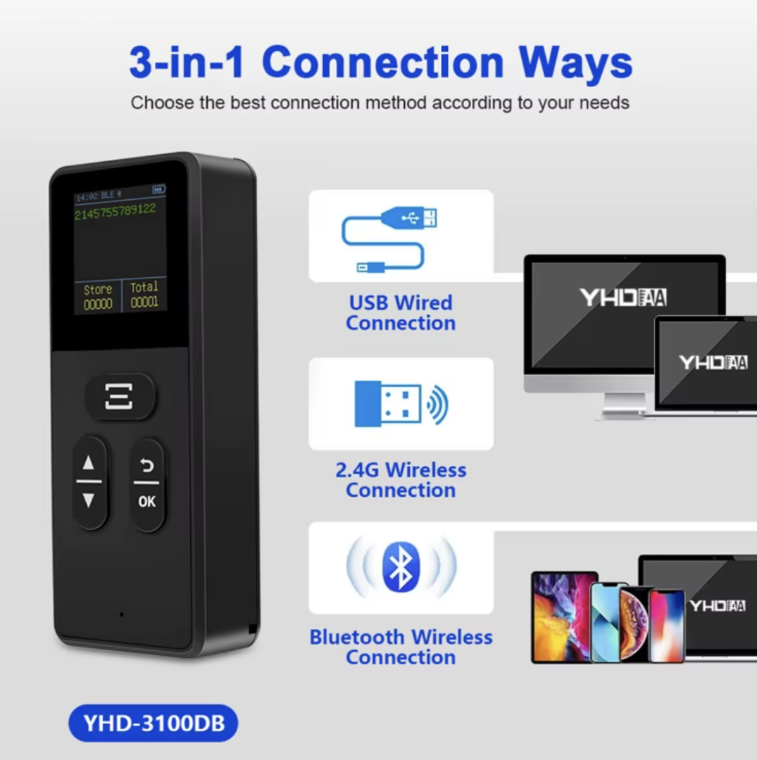 Praktická čtečka QR a čárových kódů YHDAA YHD-3100DB je ideální pomocník pro logistiku, sklady, prodejny i mobilní použití. Lehká, rychlá a univerzální – díky Bluetooth, 2.4G bezdrátu i USB kabelu ji snadno připojíte k počítači, tabletu i telefonu. Ať už potřebujete inventuru ve skladu nebo rychlou obsluhu na pokladně, tahle mini čtečka vás nezklame.